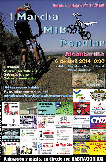 LA PEÑA CORRE-CAMINOS SERA LA ENCARGADA DE ORGANIZAR ESTA 1º MARCHA MTB DE ALCANTARILLA, EL DESEO DE TODOS LOS QUE ORGANIZAMOS ESTA MARCHA ES PASAR UN DIA DE CONVIVENCIA CON NUESTRA MTB, UN DIA QUE NO OLVIDEMOS Y QUE SE PUEDA REPETIR AÑOS TRAS AÑO,